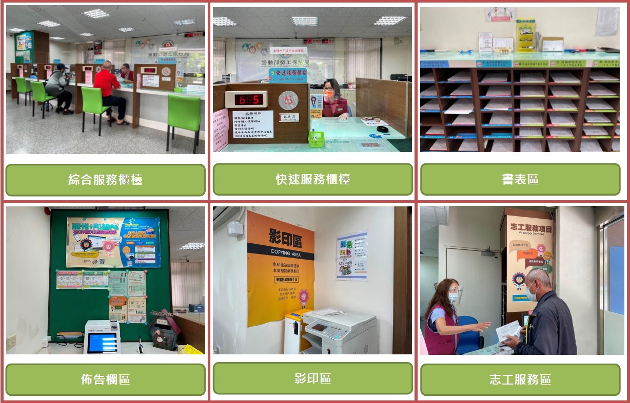 綜合服務櫃檯(1、2、3、6號櫃檯):本處設有4個單一窗口櫃檯,抽號「綜合服務」,依叫號順序至櫃檯辦理,提供投保單位及個人本局各項業務服務。